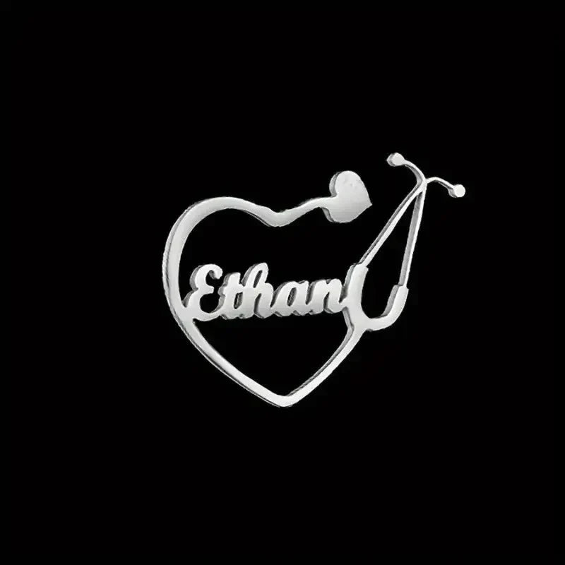 A personalized stethoscope brooch pin, custom engraved to add a unique touch to your professional attire. Perfect for healthcare workers, this elegant accessory combines style and function, making it a thoughtful gift for doctors, nurses, and medical professionals