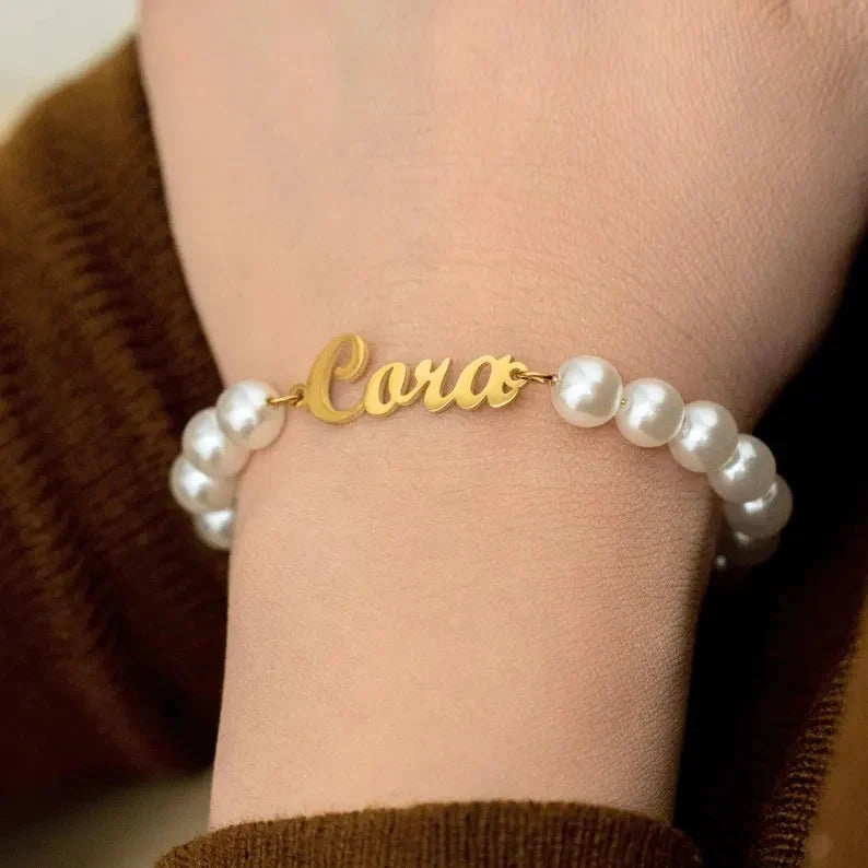 Personalize your wrist with this elegant custom script name and pearl bracelet. Crafted with lustrous freshwater pearls and delicate metalwork, this piece combines timeless sophistication with meaningful personalization. The custom engraving allows you to add a name, initials, or special message, making it an ideal gift for loved ones or a treasured keepsake for yourself. Perfect for weddings, anniversaries, or everyday elegance, this bracelet seamlessly transitions from casual to formal occasions while maintaining its refined aesthetic.