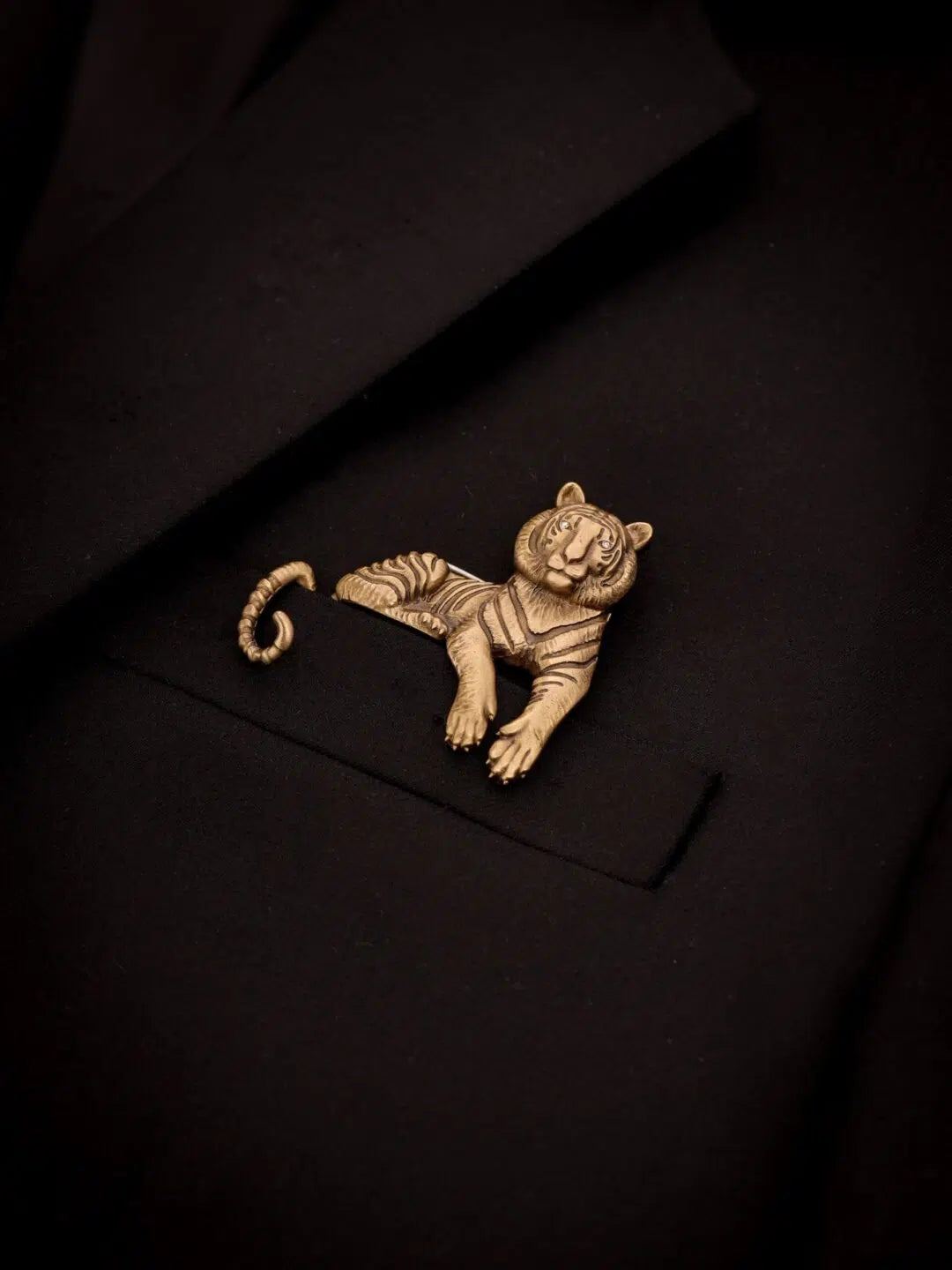 Regal yet relaxed, the Enigmatic Stripes Brooch captures the quiet confidence of the majestic tiger. Resting gracefully yet exuding an air of authority, this piece is a perfect balance of strength and ease. The intricately carved stripes and piercing gaze reflect the soul of a ruler?watchful, powerful, and unshaken. Designed to perch effortlessly atop your pocket, it symbolizes courage, patience, and an unbreakable spirit. Wear it as a tribute to those who command respect not by force, but by presence.