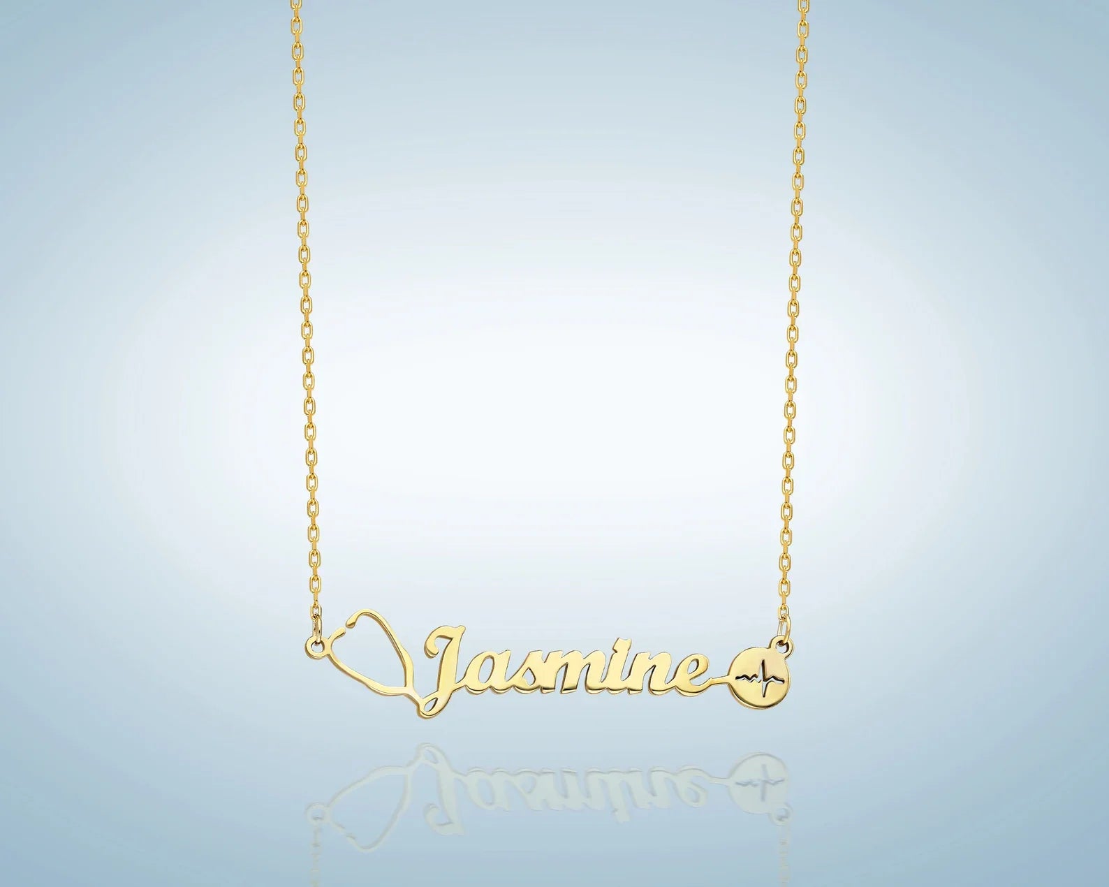 Elevate your style with our Gold Personalized Stethoscope Name Necklace. This unique piece features a stunning stethoscope design with your name engraved. Perfect for nurses or anyone in the medical field. Customize yours now and add a personalized touch to your everyday look.