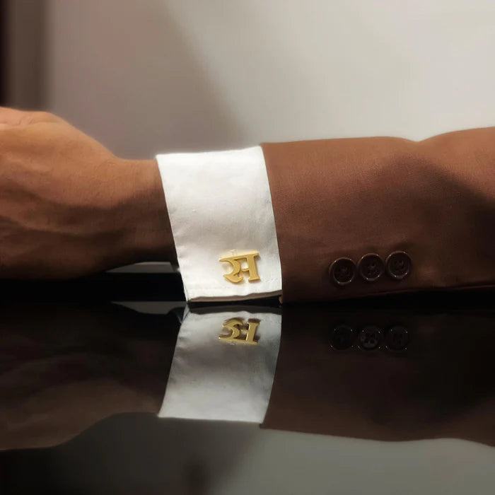 These initial cufflinks feature elegant Hindi characters, crafted to add a distinctive cultural touch to your formal attire. Made from high-quality materials, they offer durability and a refined look suitable for professional and special occasions. Elevate your style with these expertly designed cufflinks that blend tradition with sophistication.