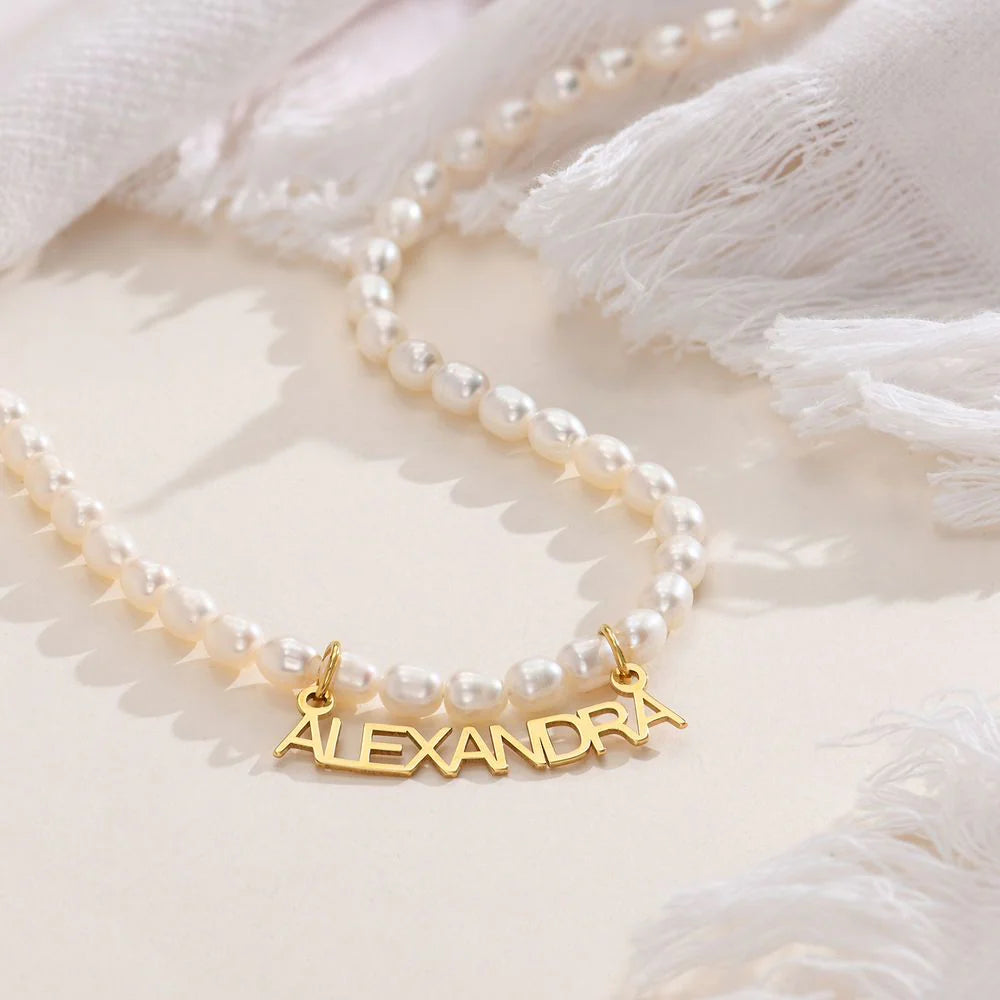 Elevate your jewelry collection with this exquisite personalized name necklace, featuring a lustrous pearl pendant paired with your custom engraving. The Chiara design combines timeless elegance with modern personalization, making it an ideal choice for meaningful gifts or self-expression. Crafted with attention to detail, this piece seamlessly transitions from everyday wear to special occasions. The pearl's natural iridescence catches light beautifully, while your personalized name adds a distinctive touch that celebrates individuality. A sophisticated accessory that speaks to refined taste and sentimental value.