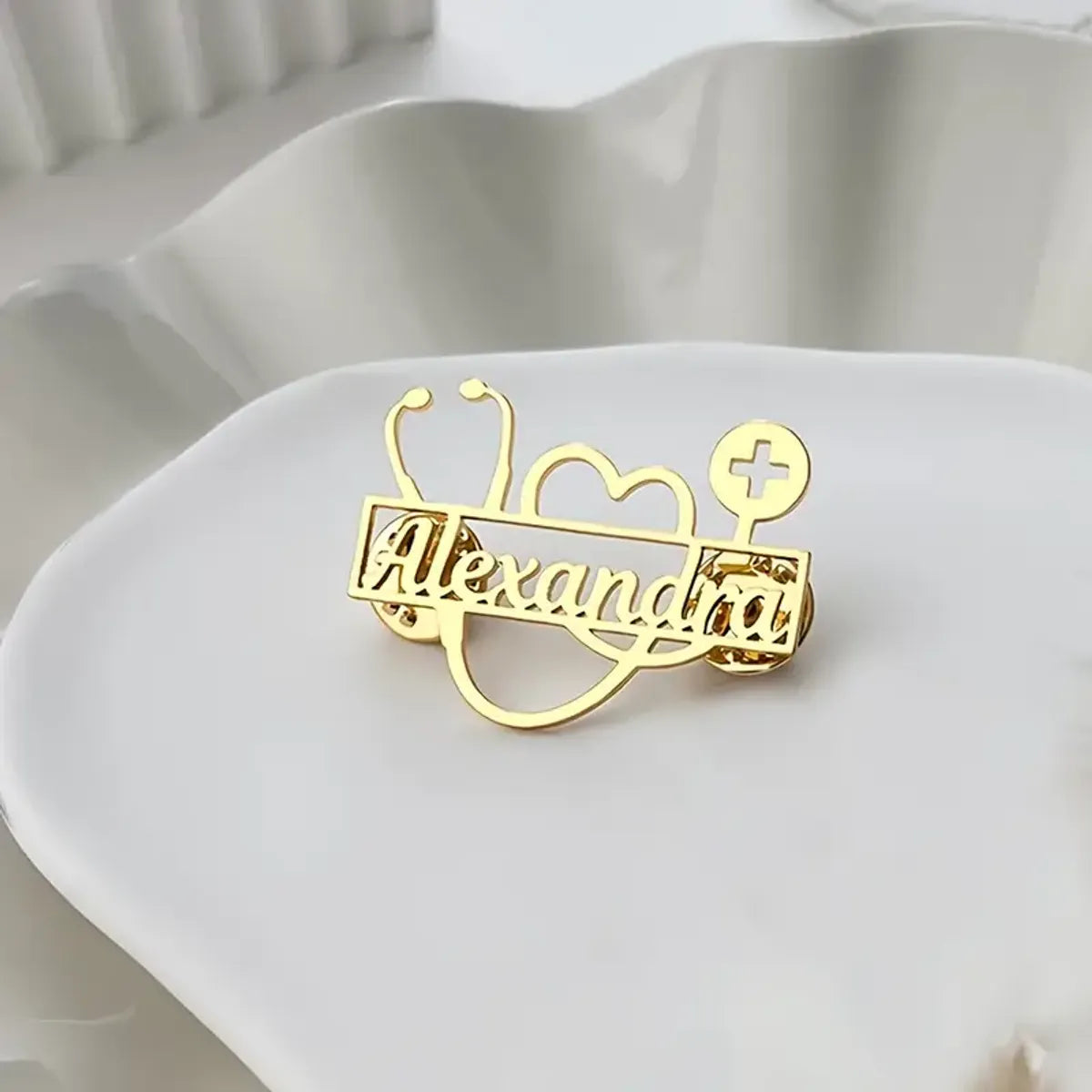 A Personalized Stethoscope Logo Name Brooch is a custom-designed accessory that features a stethoscope logo alongside a personalized name or initials. It's typically worn by medical professionals, such as doctors or nurses, as a stylish and functional way to showcase their identity. The brooch combines both professional symbolism and a personal touch, making it a unique and meaningful accessory for healthcare workers.
