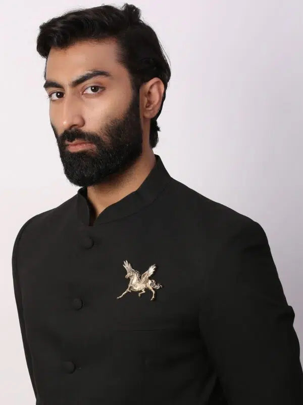 Featuring exquisitely crafted vintage Pegasus horse Brooch in antique gold.This is made of brass metal. Wear this precious adornment on a bandhgala or any jacket.This brooch sure is a wedding essential.